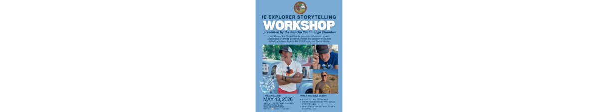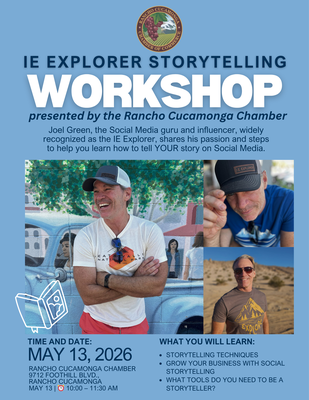 Join us on May 13 from 10:00–11:30 AM at the Rancho Cucamonga Chamber Offices as Joel Green, the Social Media guru and influencer, widely recognized as the IE Explorer, shares his passion and steps to help you learn how to tell YOUR story on Social Media.